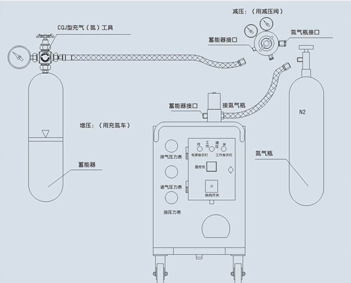 CQJ系列蓄能器充氮工具是蓄能器進行充氣、補氣、修正氣壓和檢查充氣壓力等必不可少的專用工具。它具有結(jié)構(gòu)緊湊、安全可靠、承高壓、耐沖擊、使用方便等特點。